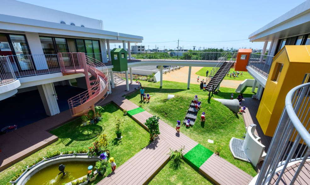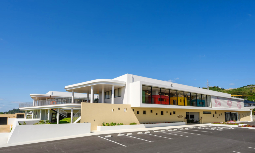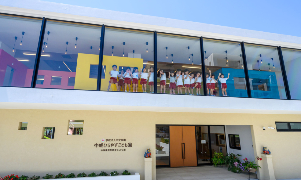 学校法人 中城ひらやすこども園は、人口増加に伴う教育・保育ニーズの高まりを受けて、村内2つの公⽴幼稚園を閉園し、官⺠連携の新たな枠組み整備された定員300 人のこども園です。