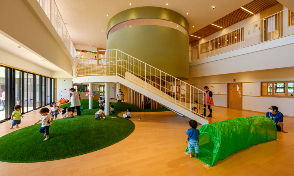 吹き抜けのある1 階ホールには、滑り台やブランコ付の階段、人工芝で起伏をつけた芝山、大樹をモチーフとした「でん」や図書コーナー等を設置しました。登園した子ども達の「わくわく心」をくすぐる、もう1 つの中庭です。雨の日でも楽しく過ごせ、園舎には子ども達の笑い声が満ち溢れます。
