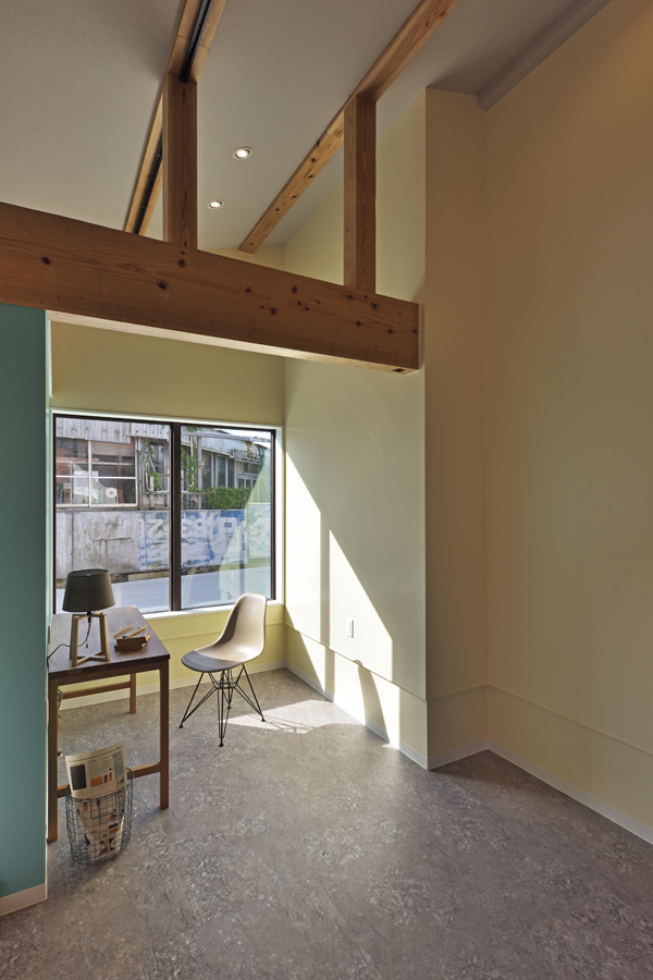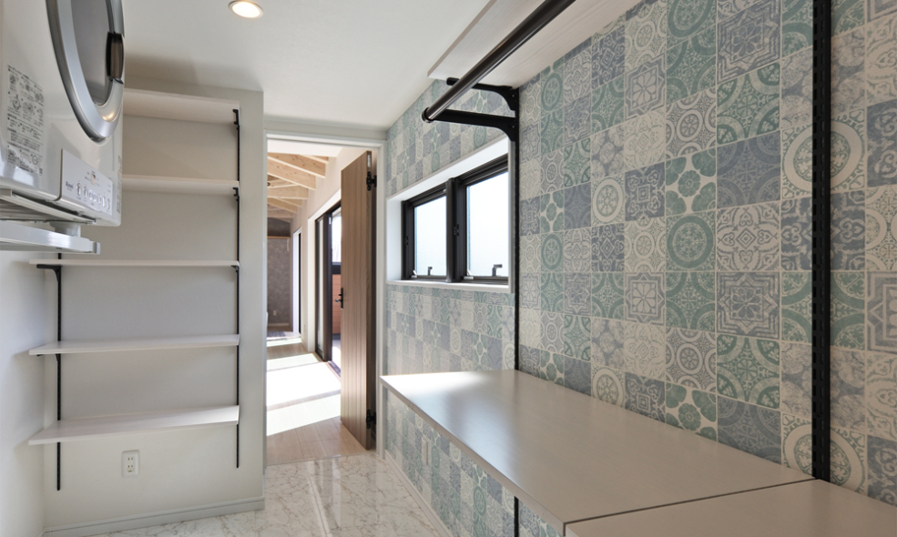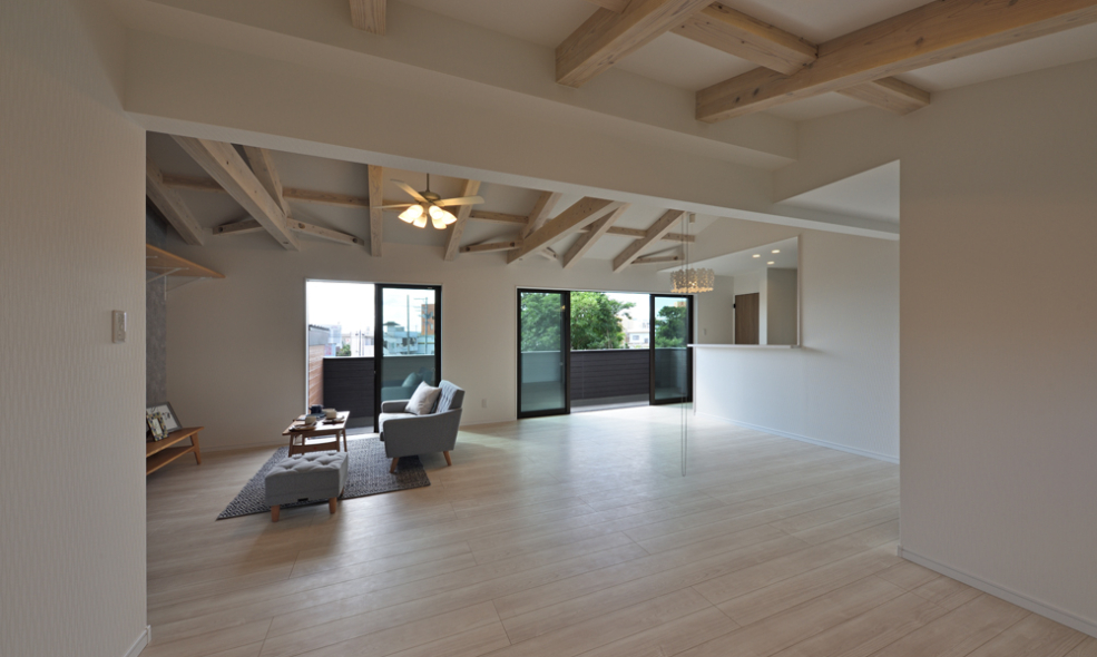 木造の2世帯住宅となるH邸は、リビングに面してオープンスペースを設け、将来必要に応じて仕切り、子供室としても使える機能的な間取りを提案しました。フレキシブルに自由に、さまざまな工夫で使い方が広がり、家族の暮らしに合わせてカスタイマイズできます。また、キッチンからの作業効率を優先して水廻りをコンパクトにまとめ、仕事がはかどる回遊性のある家事動線をつくりました。
