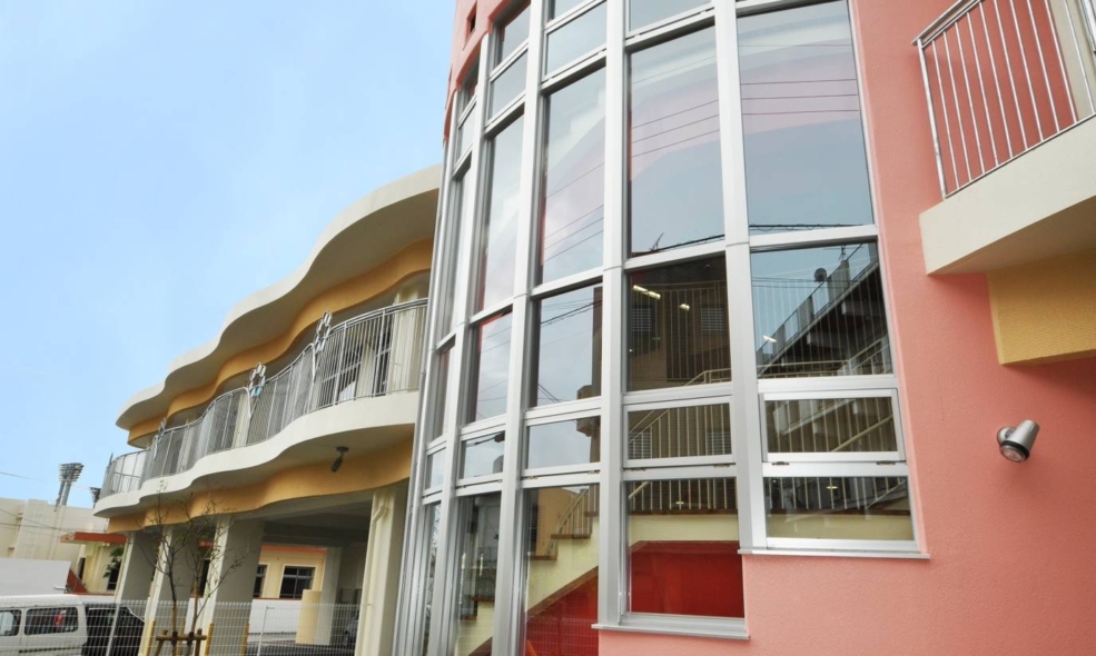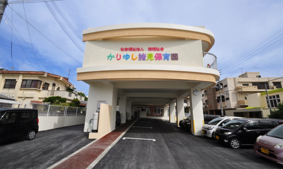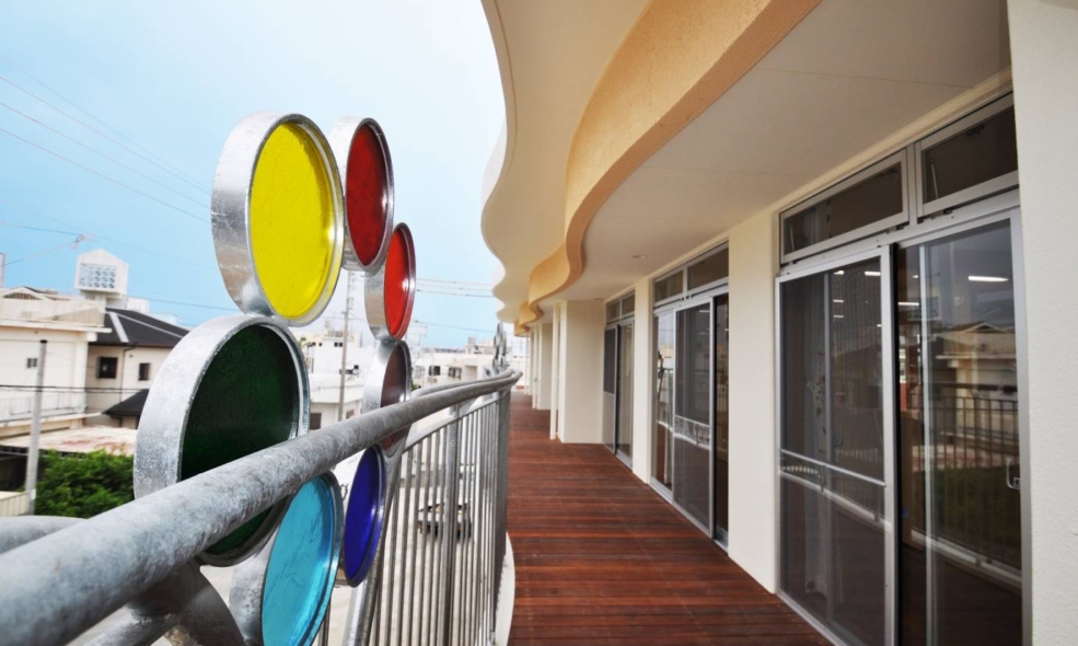 沖縄市に建つK保育園。 絵本『にじいろのはな』のように、いろんな⼈にやさしさを分け与えてあげられる優しい⼦にすくすくと育ってほしいとの想いを込めて設計しました。