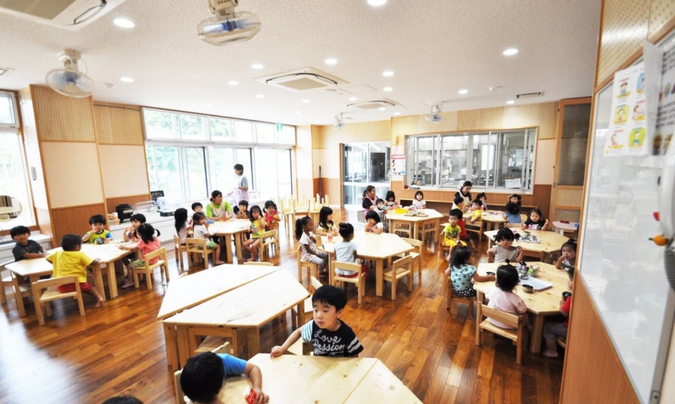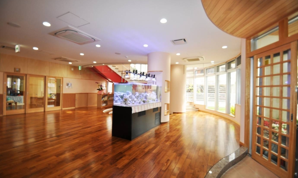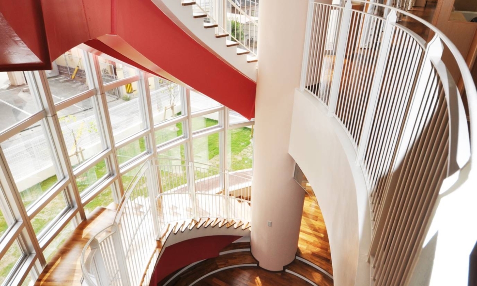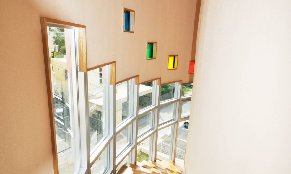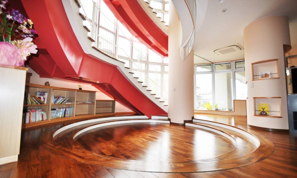 にじいろカラーのある園舎曲線のあるデザインで空間にやさしさを表現。 「にじいろ」は、カラーガラスを使って、 ⼩窓や内外装の随所に取り⼊れ、遊び⼼をくすぐるデザインとしました。