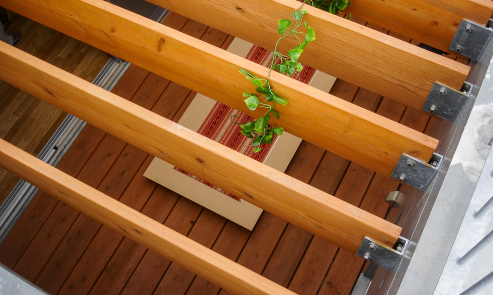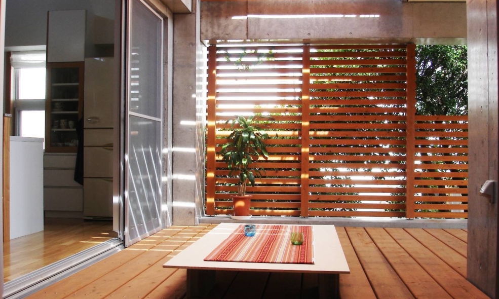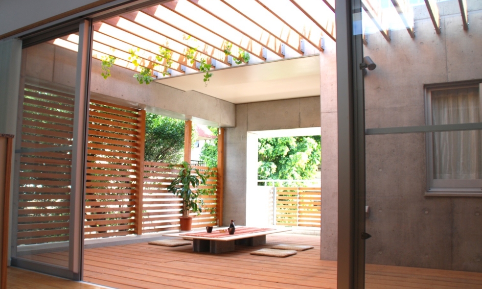 外からの視線を遮り、やわらかな光と⾵が流れるオープンデッキは、第⼆のリビング。