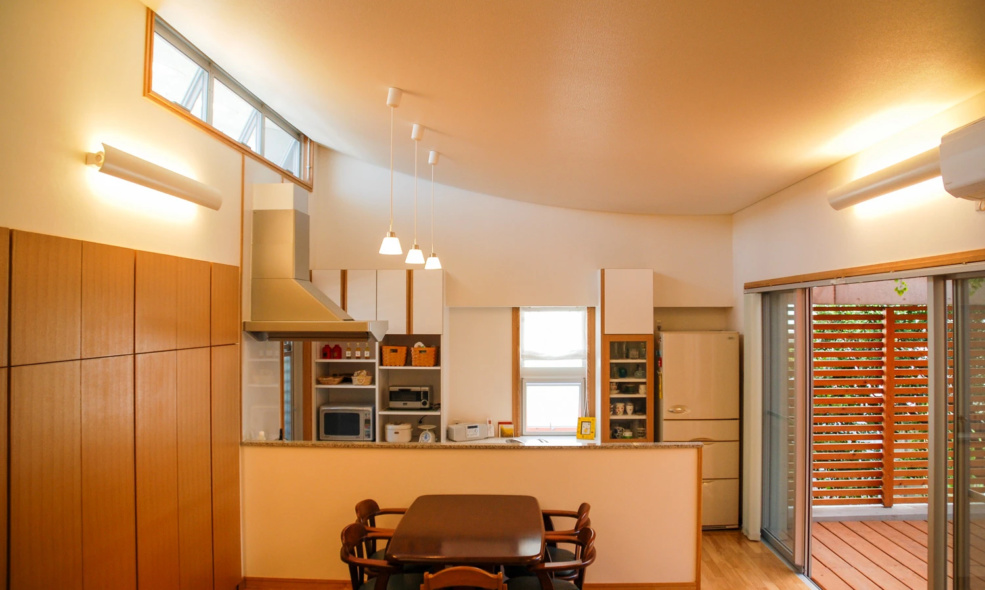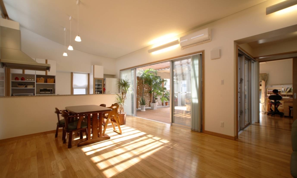 室内とゆるやかにつながるオープンデッキは、ダイニングキッチンからの料理の配膳もスムーズ。