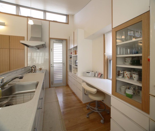 キッチンにはちょっとした机を設け、家事の合間、スタディスペースとして利⽤できるよう⼯夫。