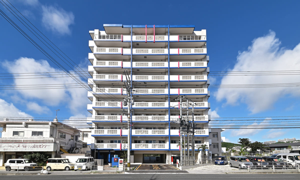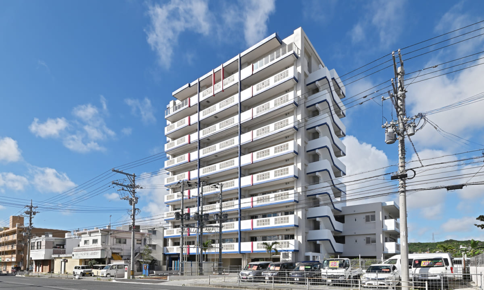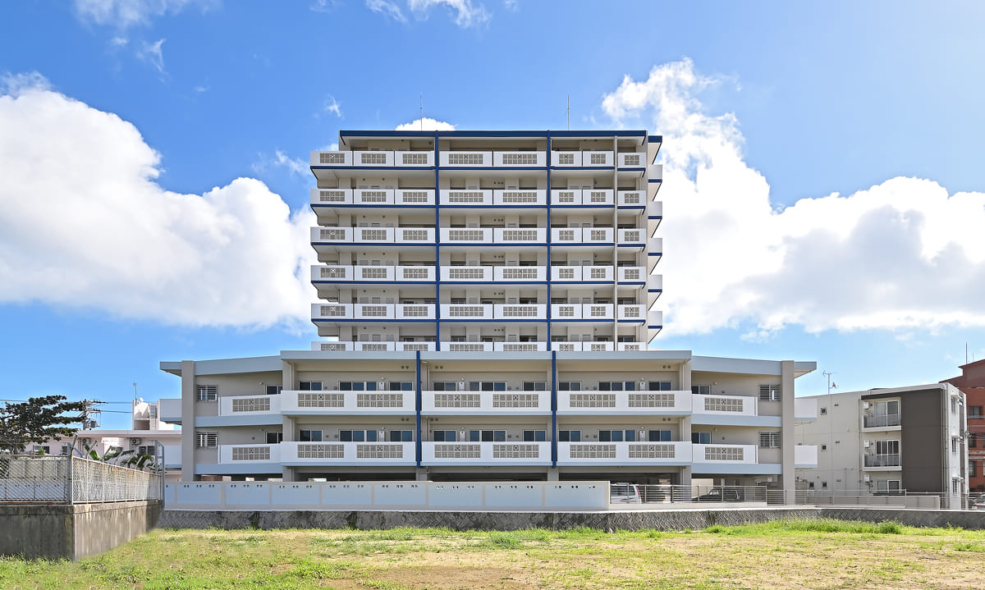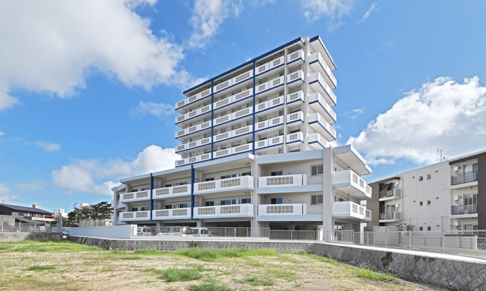 計画された敷地の東側が近隣商業地域で⻄側が第⼀種低層住居専⽤地域であることから東側が高層(10階建)、⻄側が低層(3 階建)となる特徴的な建物形状となり、周辺に高い建物もないことから、周辺地域のランドマークとなります。
