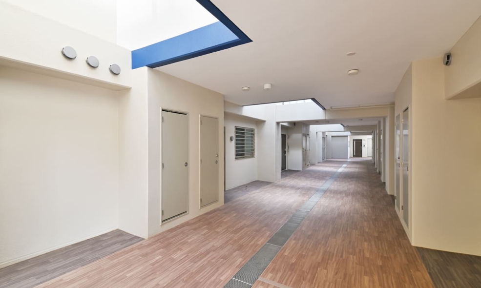 2階、3階では、高層部分と低層部分の間に巾5mの中廊下が計画され、集合住宅の廊下としては、⼤きく、ゆとりがあることから、居住者の様々な使い方が可能となる空間となります。