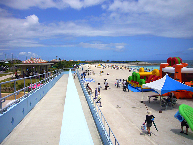 東海岸(あがりざと)のイメージを一新し、憩い、活力ある空間づくりを工夫。出会いと交流、自然との共存、バリアフリーにも配慮している。