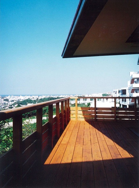 緑深い丘陵の合間に⾒える街並み、その向こうに限りなく広がる⻘い海、空―デッキバルコニーからの眺め。