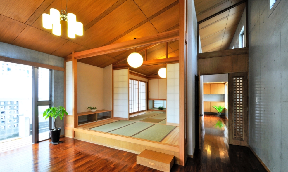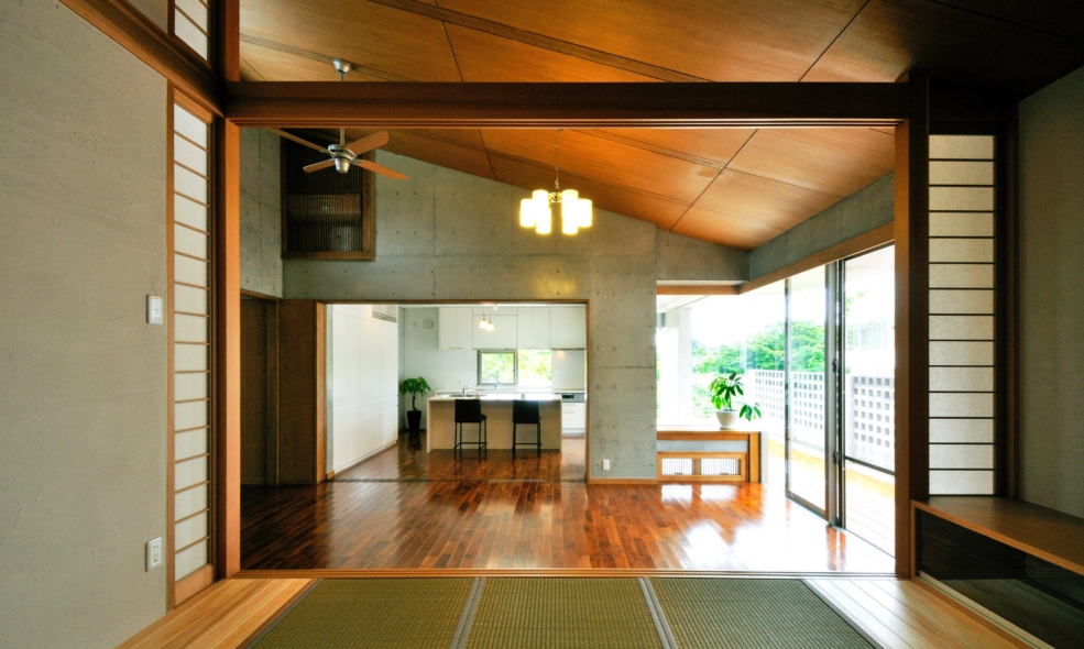 和室、リビングキッチンは障子をはずすと36 帖の大広間となり、交流の場が広がります。 和室、家族室、ダイニングキッチンのあるパブリックスペースと、 寝室・浴室のあるプライベートスペースを分け、プライバシーを確保しながら、 開放的な集いを楽しめるつくりとしました。